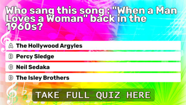 If you can answer "Who played "Ferry Cross The Mersey" during the 1960s?" and maybe even "Who sang this song : "Everybody Loves Somebody" back in 1965?" there is a good chance that you're going to beat the average score of 7/10 in this 1960s songs quiz