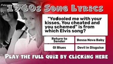 4/10 is the score to beat in this trivia quiz to put yourself over the average quiz taker. But you're probably going to be able to answer questions "Dusty Springfield sang that she closed her eyes and counted to what?" and ""You fooled me with your kisses, You cheated and you schemed" is from which Elvis son.." easy!