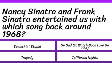 In this fun 1960s Songs quiz we're going to ask questions like "Nancy Sinatra and Frank Sinatra entertained us with which song back around 1968?" and "Scott Mckenzie entertained us with which song back around 1968?".