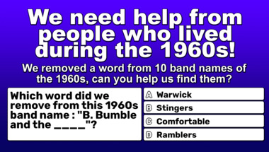 5/10 is the score to beat in this 1960s bands with a missing word quiz to put yourself over the average quiz taker. But you're probably going to be able to answer questions "Which word did we remove from this 1960s band name : "The Cuff ____"?" and "Which word did we remove from this 1960s band name : "Gerry & The ____"?" easy!