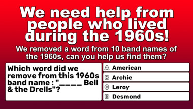 6/10 is what people on average are scoring in this 1960s bands with a missing word quiz so far. Are you ready to answer questions like "Which word did we remove from this 1960s band name : "Paul & ____"?" and "Which word did we remove from this 1960s band name : "Peter & ____"?"