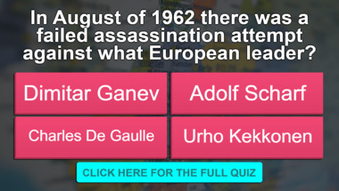 If you can answer "In August of 1962 there was a failed assassination attempt against what European lead.." and maybe even "Francis Chester became the first person to solo sail around the world, he was from wh.." there is a good chance that you're going to beat the average score of 7/10 in this trivia quiz