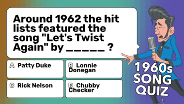 In this fun trivia quiz we're going to ask questions like "Around 1962 the hit lists featured the song "Let's Twist Again" by _____ ?" and "Around 1960 the hit lists featured the song "My Happiness" by _____ ?".